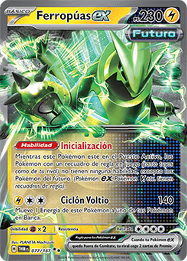 Su baraja se compone de Pokémon de Futuro con: Ferrotesta Ex, Ferropalmas Ex y Ferropúas Ex. Con Miraidon consigue energías, y con Ferropalmas Ex y el apoyo de Ferrotesta Ex en Banca, consigue lanzar un ataque que te permite robar un premio extra.