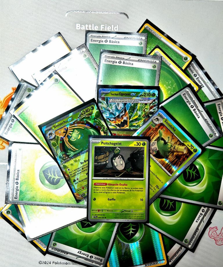 El mazo consiste en utilizar la habilidad de Ogerpon ex para tener un montón de energías en campo y pegar hasta 210 ,con Sinistcha descartando 3 energías pegas 70 con cada una.